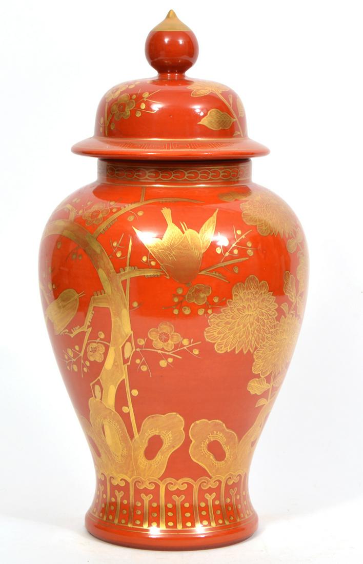 These two chinese hand painted lidded vases are contemporary but the weathered patina is designed to look ancient.